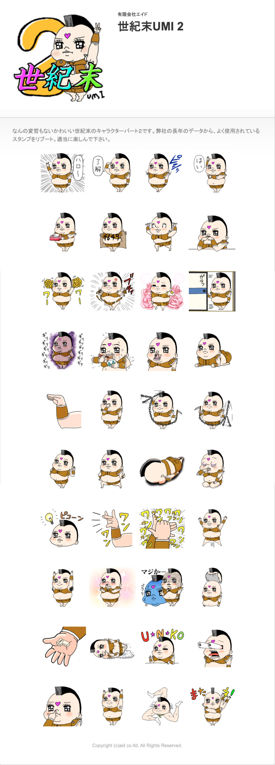 Seikimatsu Umi 2 なんの変哲もないかわいい世紀末のキャラクターパート2です。弊社の長年のデータから、よく使用されているスタンプをリブート。適当に楽しんで下さい。ついに”あの”「かえる umi 2」がスタンプになって登場!弊社の長年のデータから、よく使われているスタンプをリブート。適当に楽しんで下さい。